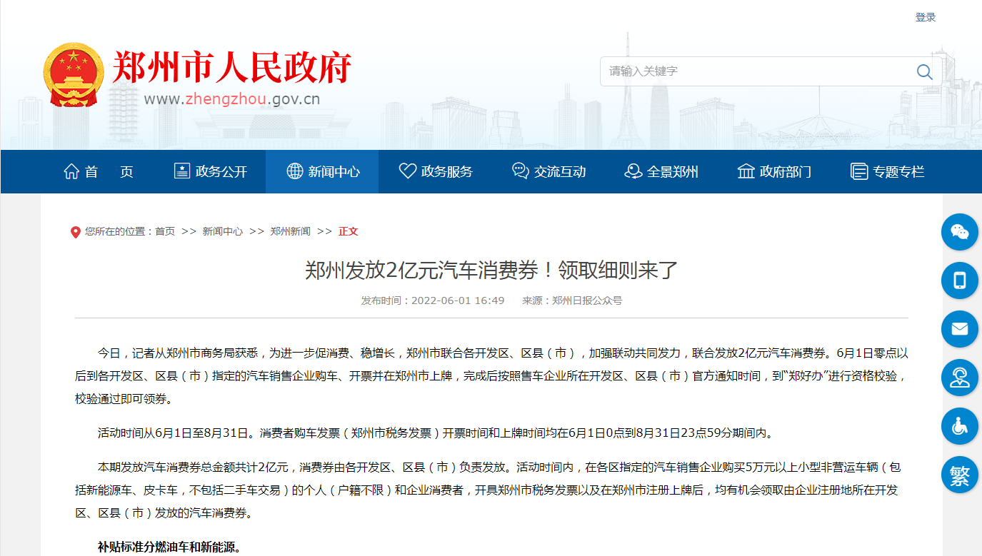个人消费者及企业单位完成新车购置及注册上牌后,根据各区汽车消费券发放启动时间通知,可通过“郑好办”APP对汽车消费券领取资格进行线上审核。