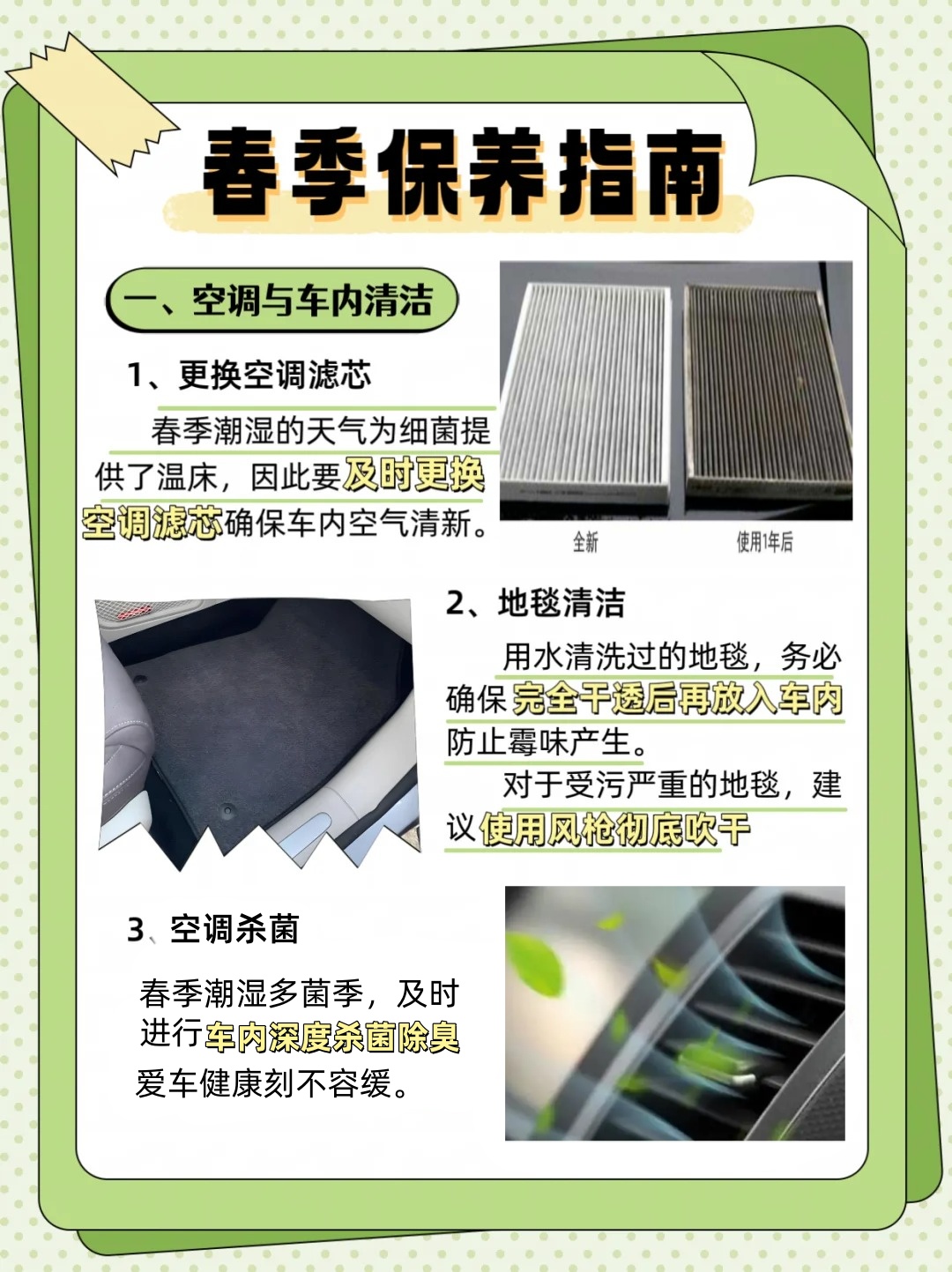 春天的潮湿天气容易滋生细菌,因此车内清洁尤为重要。