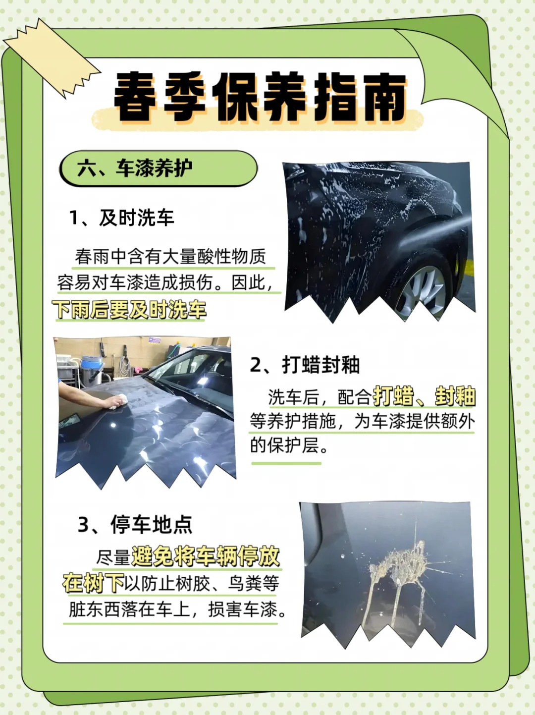 春季的雨水和阳光都可能对车漆造成损害,因此车漆养护不可忽视。